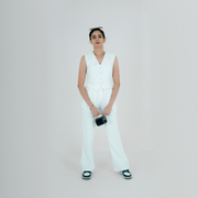 Elevate your formal wardrobe with this white waistcoat and pant co-ord set. Crafted for a sharp, tailored fit, the waistcoat features classic button detailing that adds a polished finish. Paired with matching pants, this ensemble offers a cohesive and sophisticated look ideal for professional settings or special occasions.