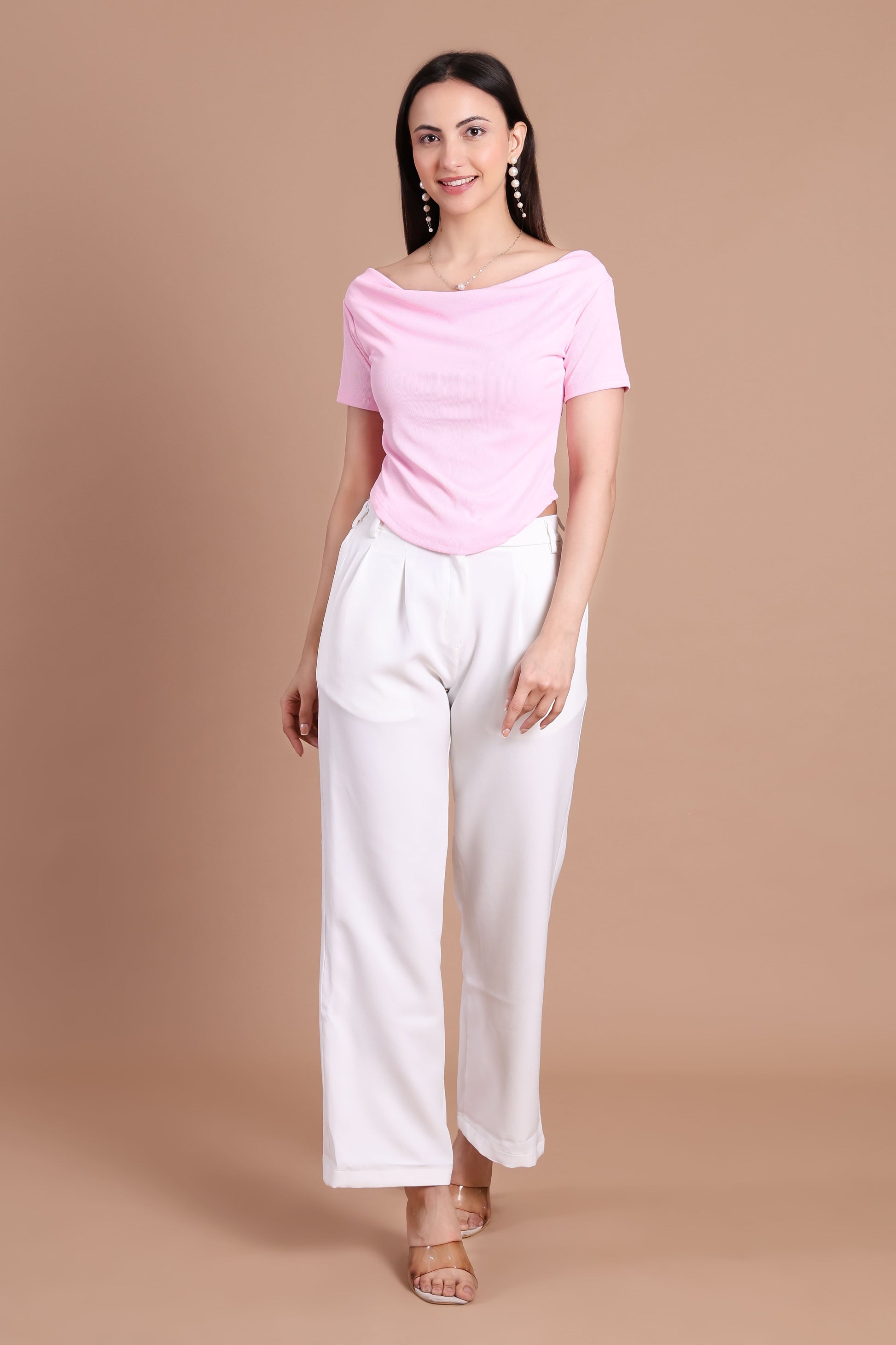 A knit fabric top with a soft cowl neckline and delicate details, designed to give an elegant and flattering everyday look.