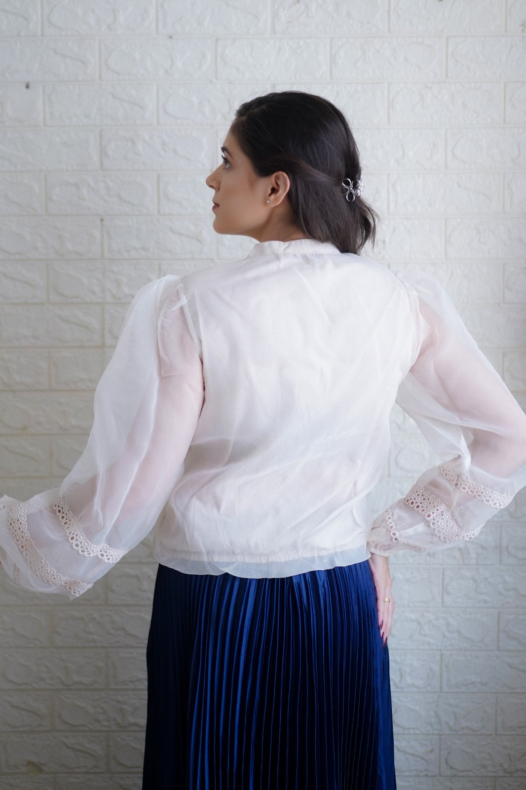 An elegant embroidered top with delicate sleeve detailing and soft puffy sleeves, designed to transition effortlessly from office hours to casual outings.